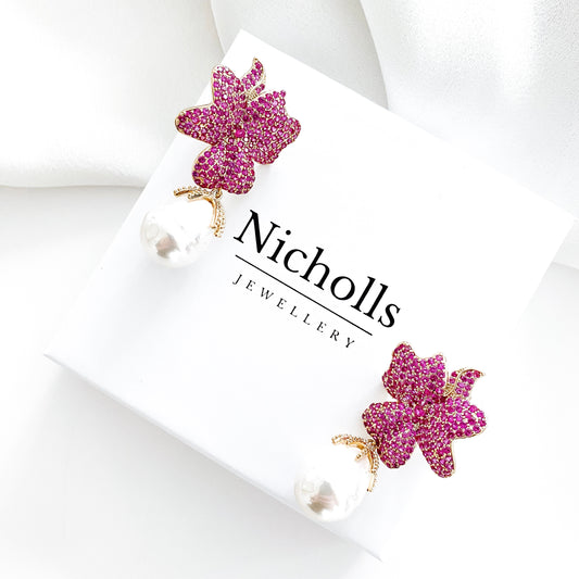 Deluxe Baroque Pearl and Pink Crystal Flower Earrings