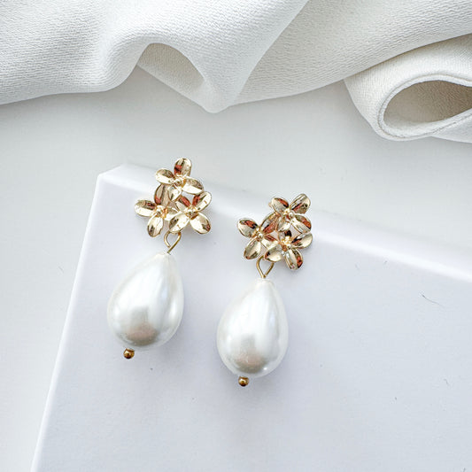 18k Gold Plated Daisy and Chunky Teardrop Pearl Earrings