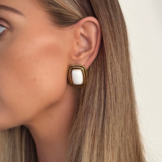 White Rectangle Gold Earrings, Waterproof, Stainless Steel Statement Earrings