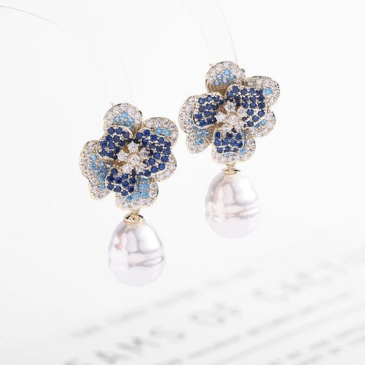 Deluxe Baroque Pearl Blue Magnolia Flower Earrings