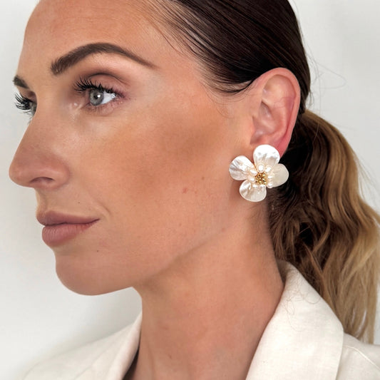 Dahlia Brushed Gold Oval Porcelain Flower Earrings