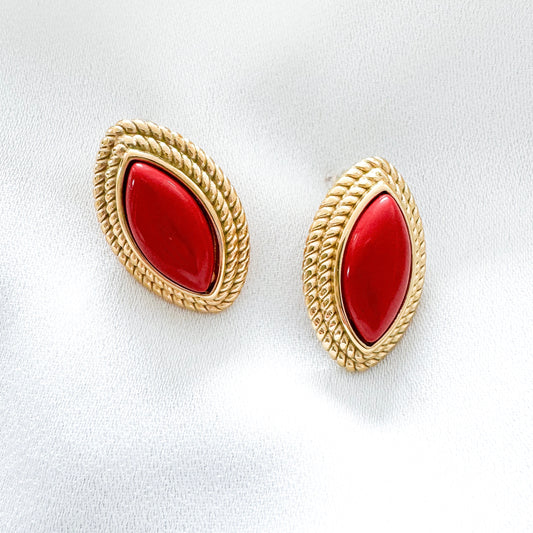 Oval Diamond Shape Red Stone 18k Gold Earrings