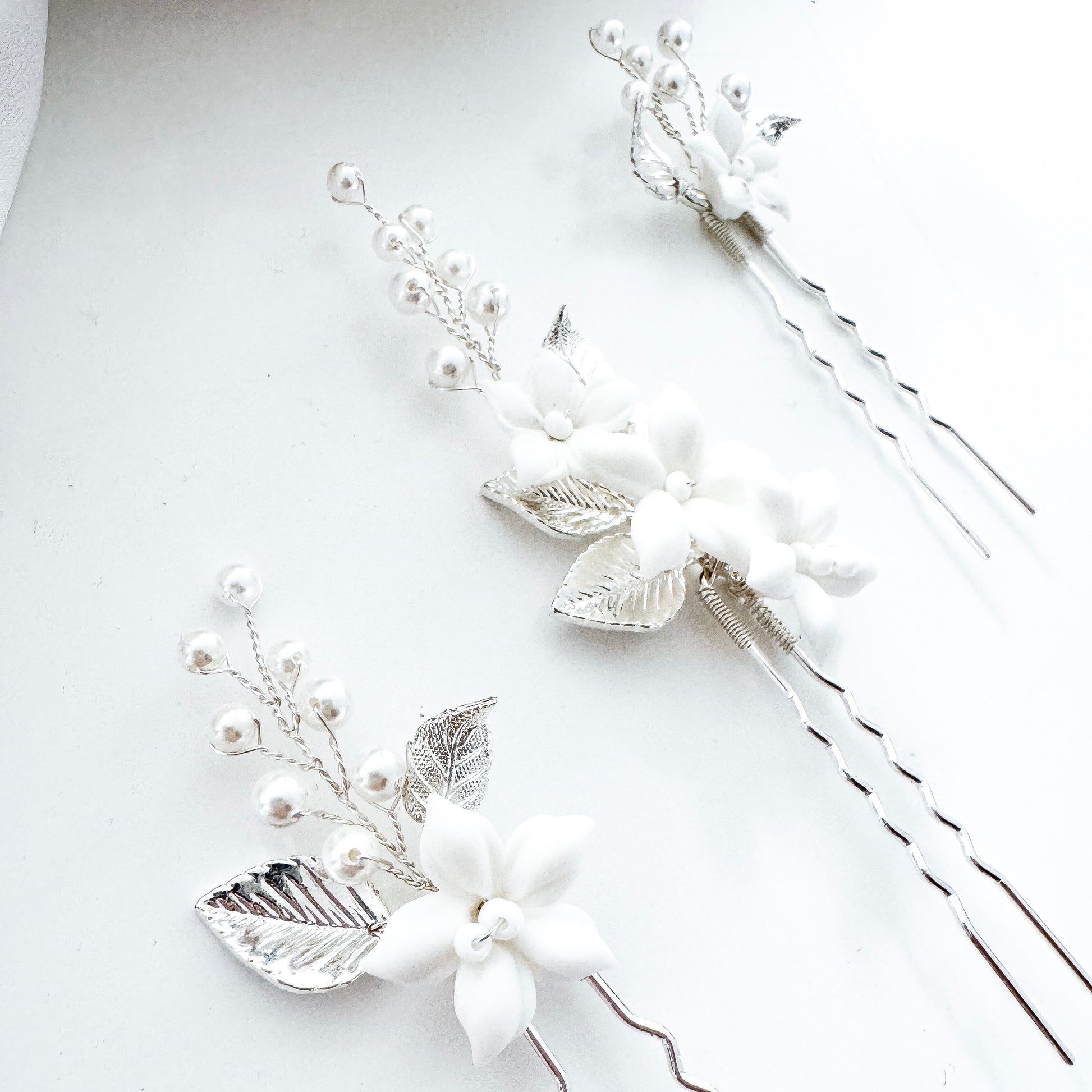 Bridal porcelain flower hair pins designed for weddings and special occasions. This beautiful set of three wedding hair pins features delicate porcelain flowers adorned with round pearls, crafted on silver wire with silver leaf detailing for a soft, refined finish.
