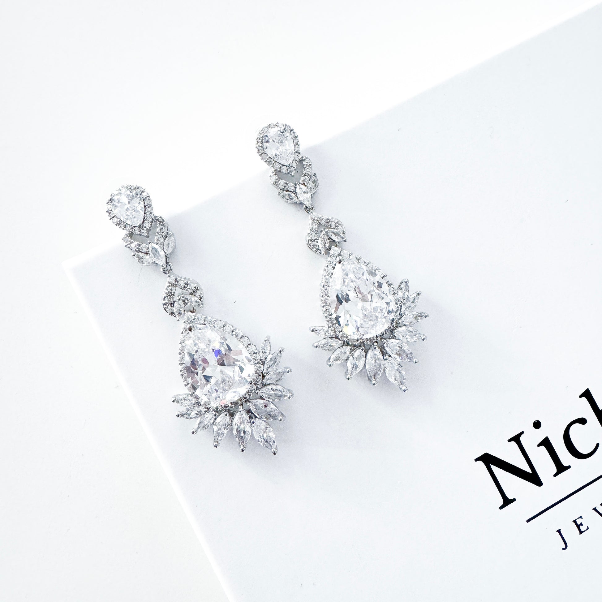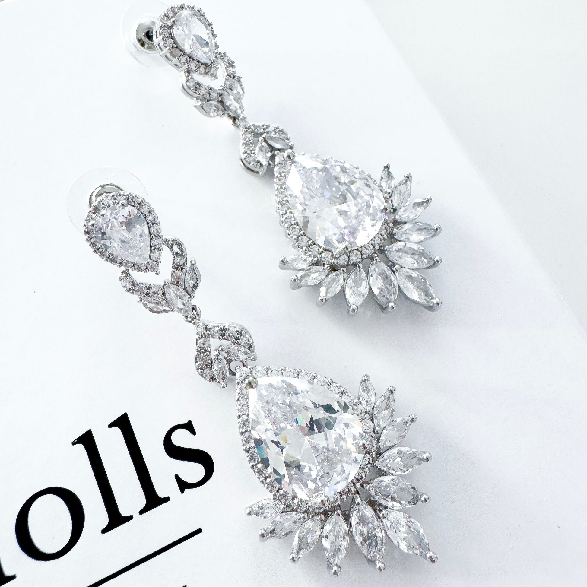 Cubic zirconia statement earrings with teardrop crystal detailing, designed for glamorous bridal, prom and black-tie occasions. Crafted with Grade 3A+ cubic zirconia crystals, these earrings deliver exceptional sparkle and brilliance that catches the light from every angle.