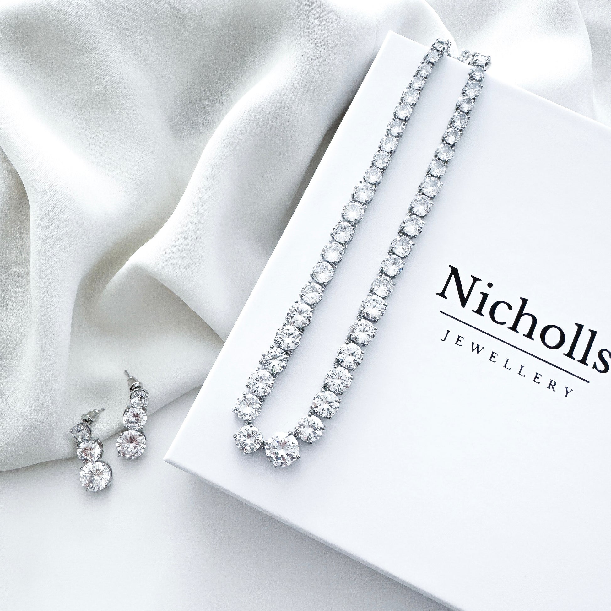 Dazzle with this AAA+ cubic zirconia crystal, rhodium plated necklace & earring set. Perfect for brides, proms & Christmas parties. Gift-boxed elegance from Nicholls Jewellery.