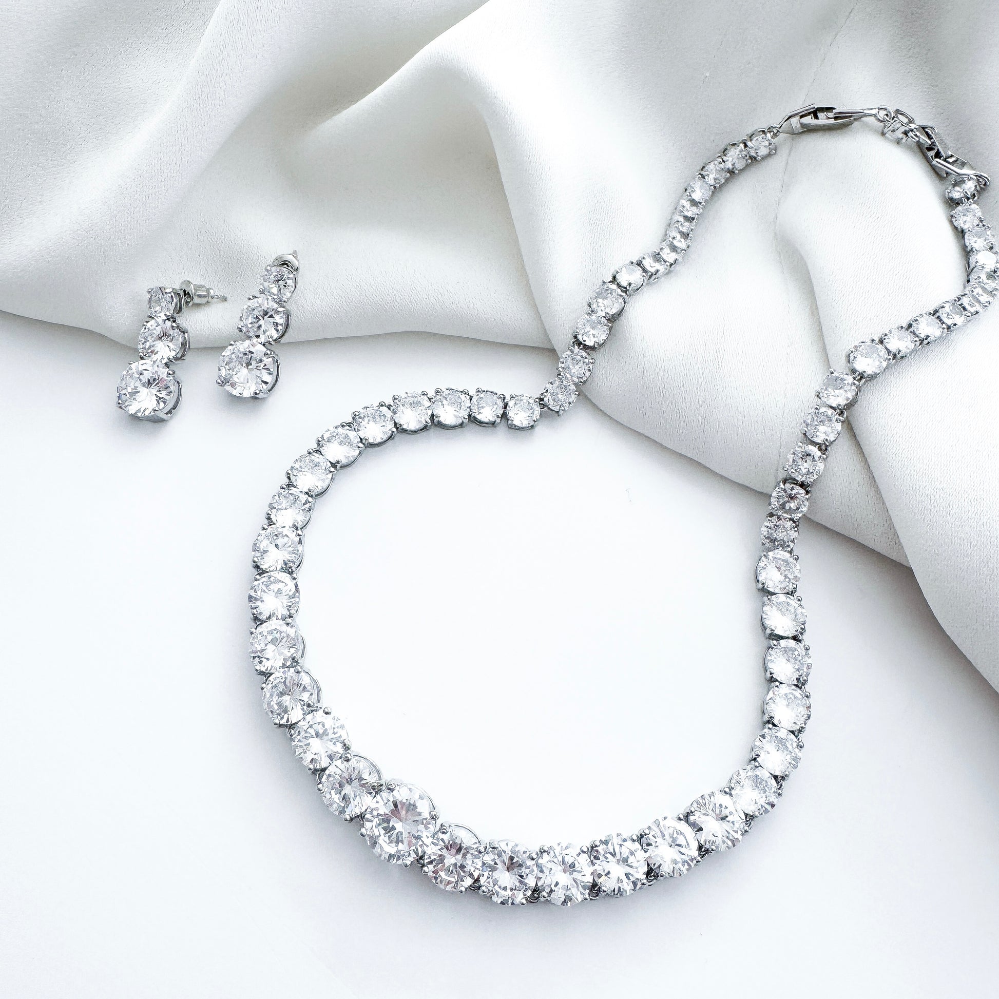 This exquisite set features AAA+ round cubic zirconia crystals, carefully graduated so that the stones are larger at the front and taper smaller around the back, creating a beautifully balanced, eye-catching sparkle. The necklace includes an adjustable extender chain for the perfect fit — whether you prefer a close, classic neckline or a slightly lower drape.