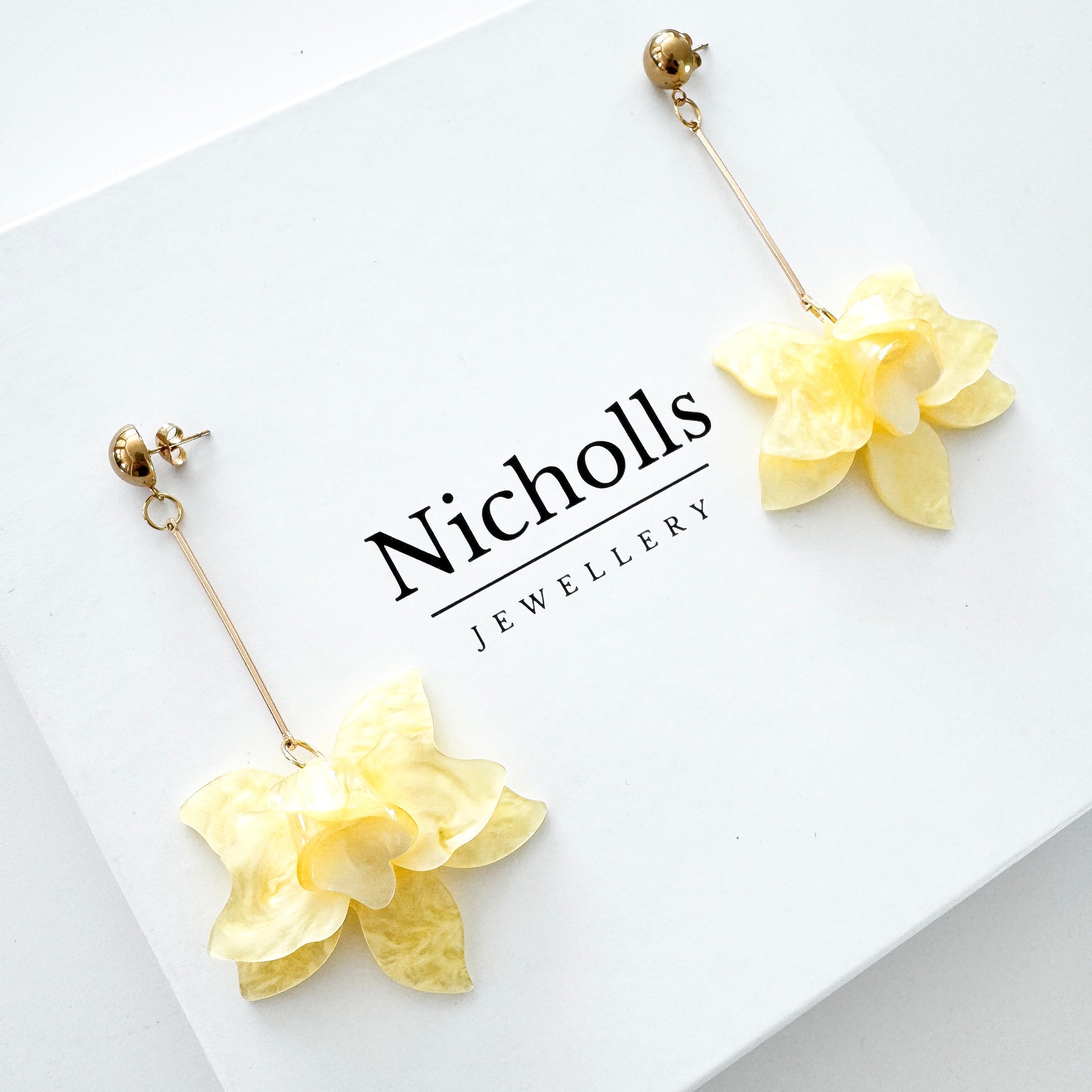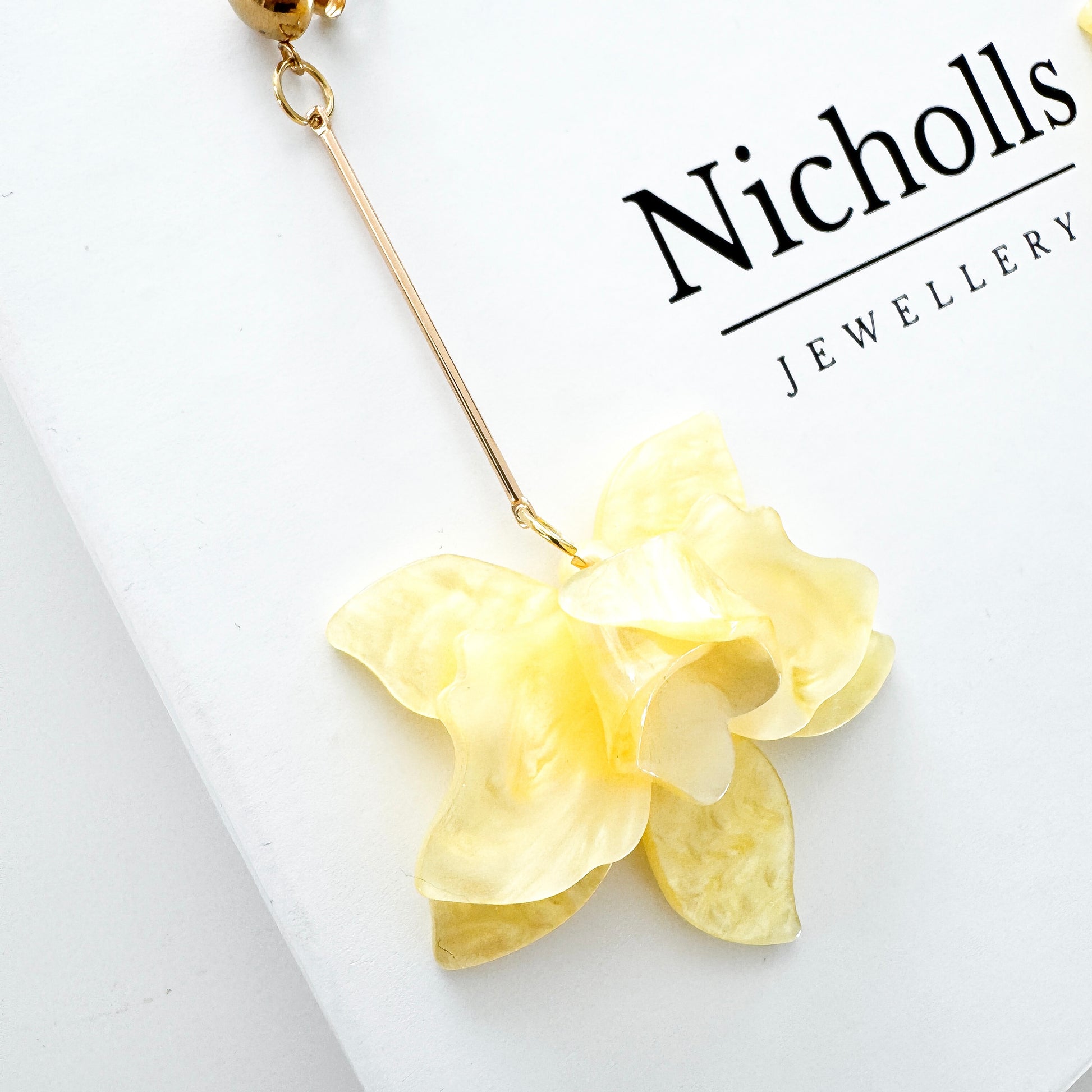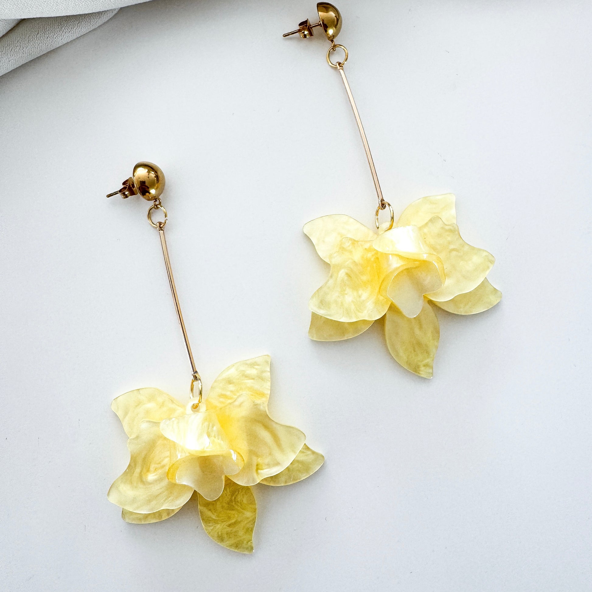 Elevate any outfit with our Francoise Sunshine Yellow Flower Dangle Statement Earrings! These unique and vibrant earrings are sure to add some fun to your wardrobe. With hypoallergenic pins and a lightweight design, they can be worn comfortably all day. Perfect for summer holidays, parties, or weddings.