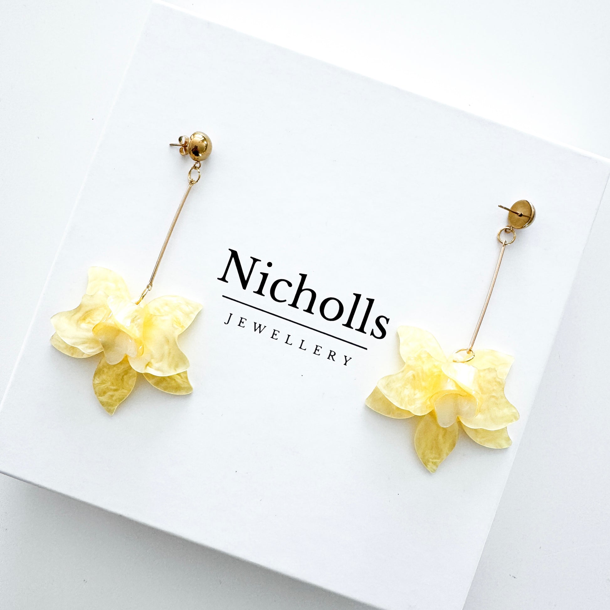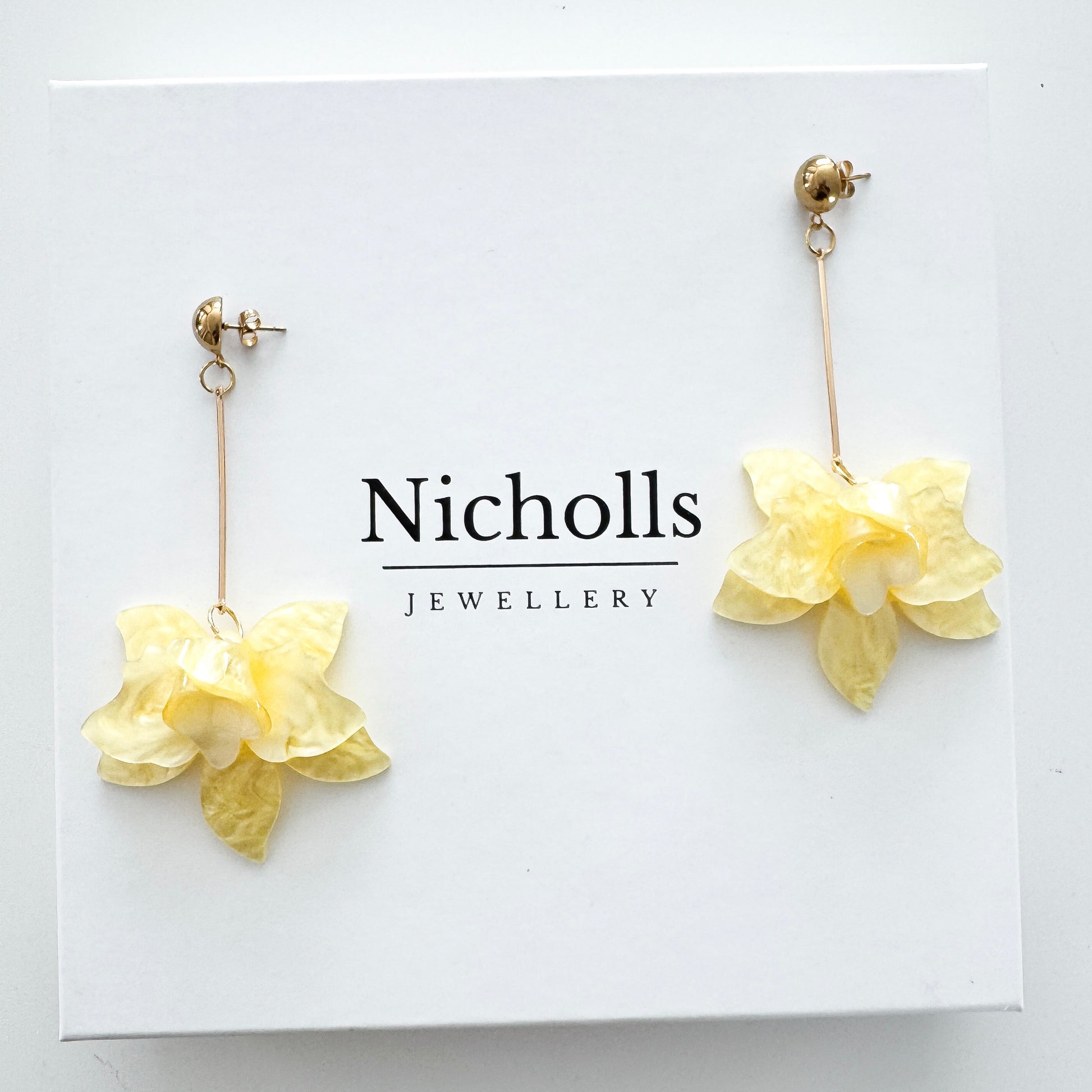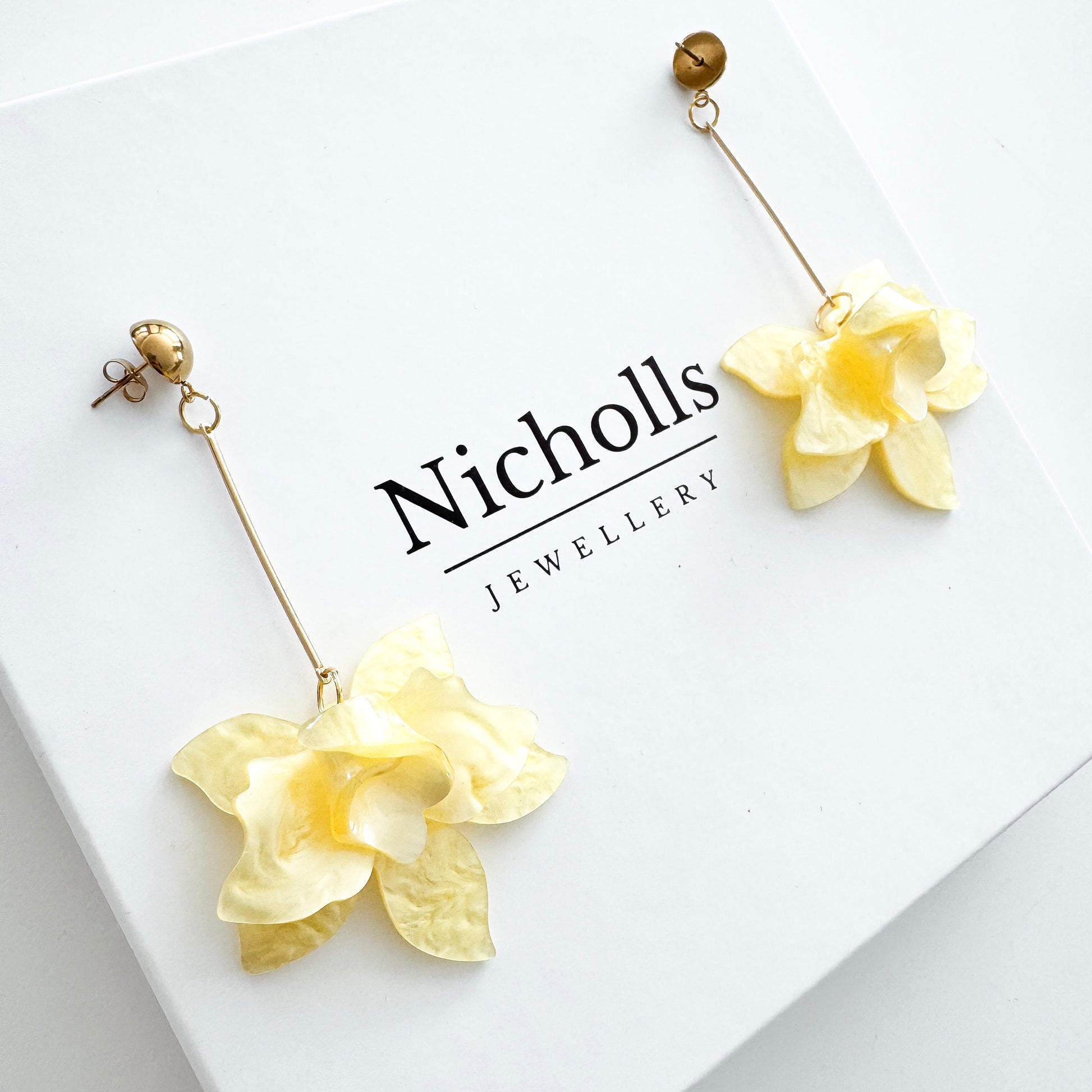 Elevate any outfit with our Francoise Sunshine Yellow Flower Dangle Statement Earrings! These unique and vibrant earrings are sure to add some fun to your wardrobe. With hypoallergenic pins and a lightweight design, they can be worn comfortably all day. Perfect for summer holidays, parties, or weddings.