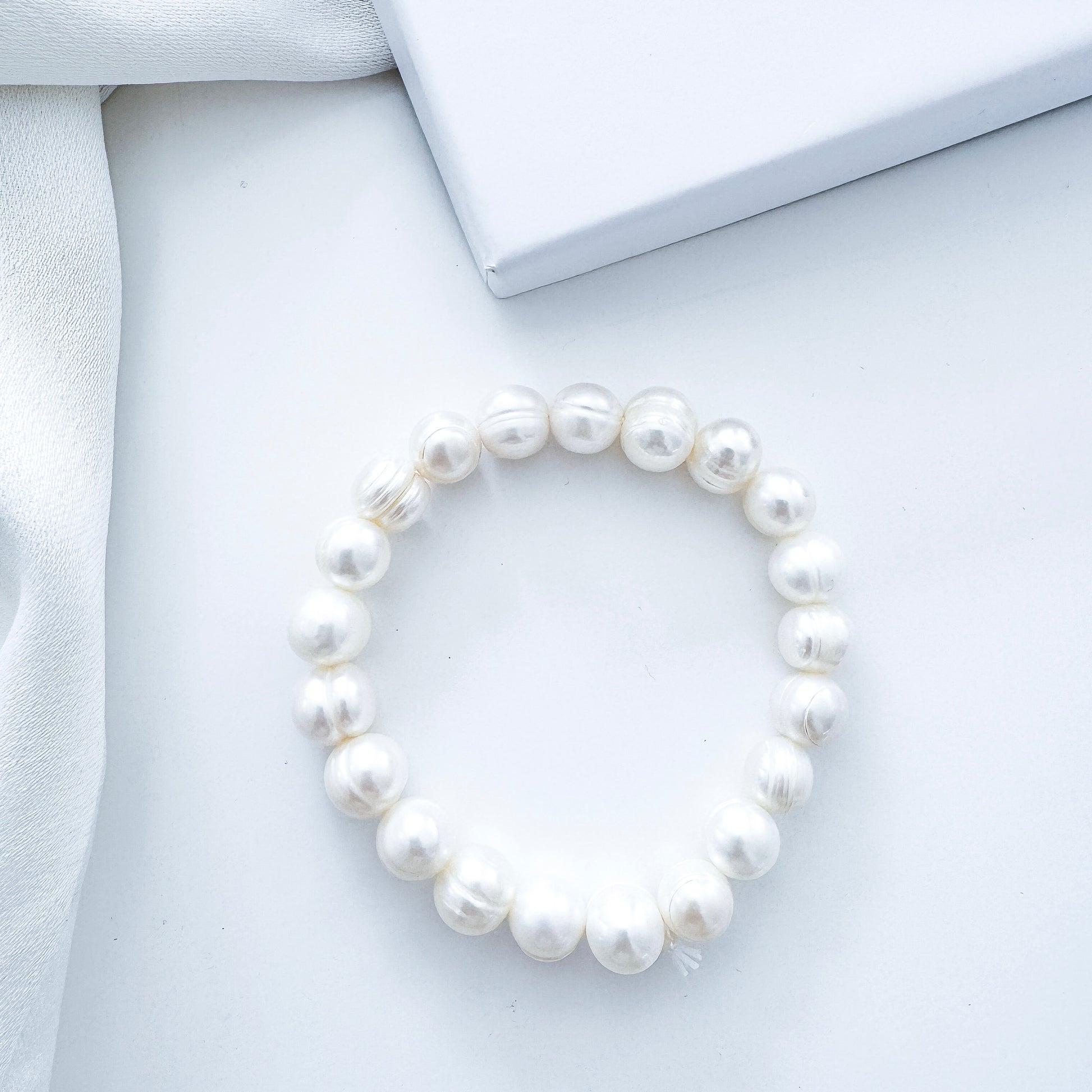 The necklace features a secure clasp closure, while the elasticated bracelet ensures a comfortable fit for every wrist size — designed to stretch seamlessly without snagging delicate fabrics or leaving loose chains. Completing the set, the stud pearl earrings offer a minimalist, refined finish that never goes out of style.