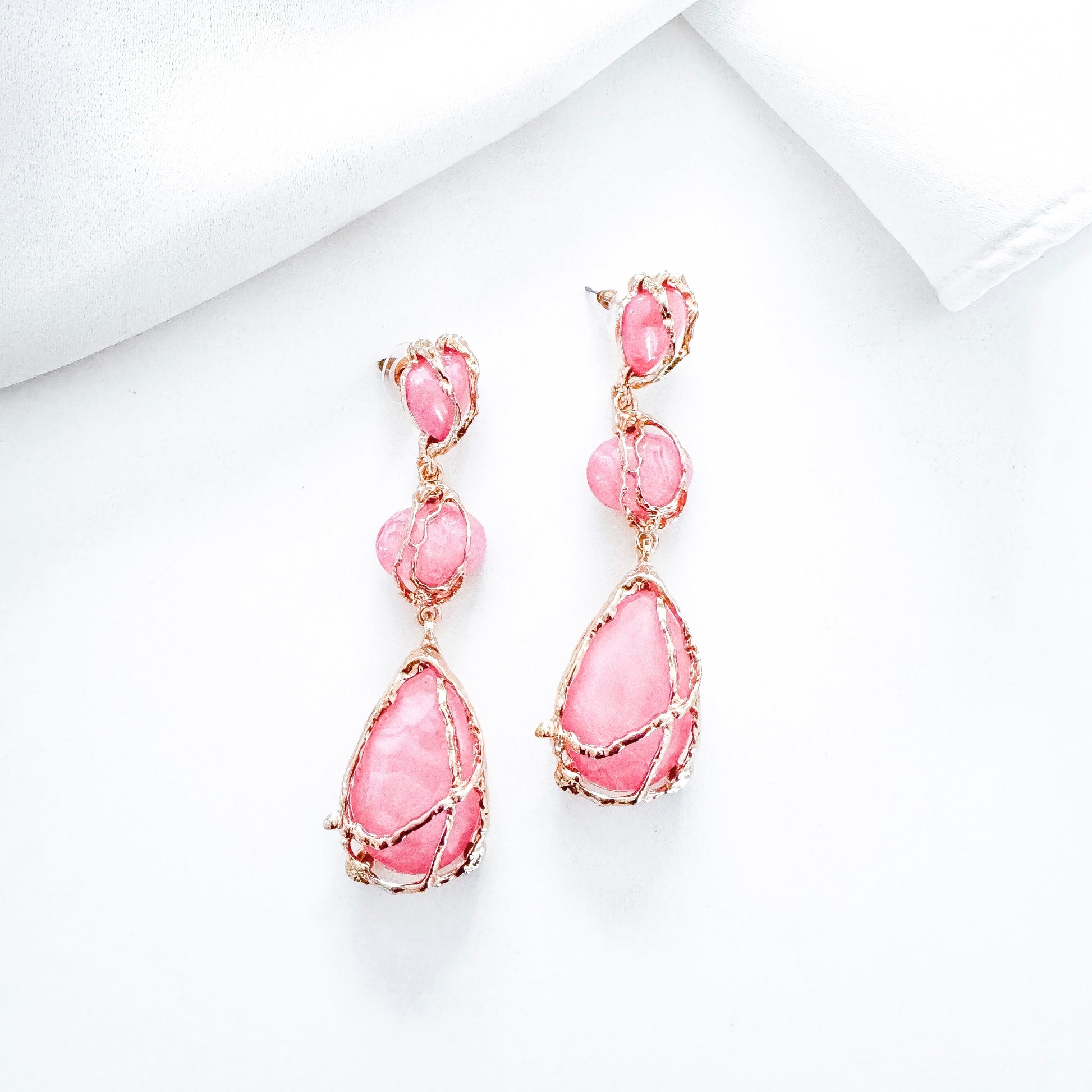 Featuring three beautifully cut chunky bright pink gemstones — two round drops and a sparkling teardrop gem — each encased in a luxurious molten gold drip design, these earrings exude modern glamour with a timeless twist.