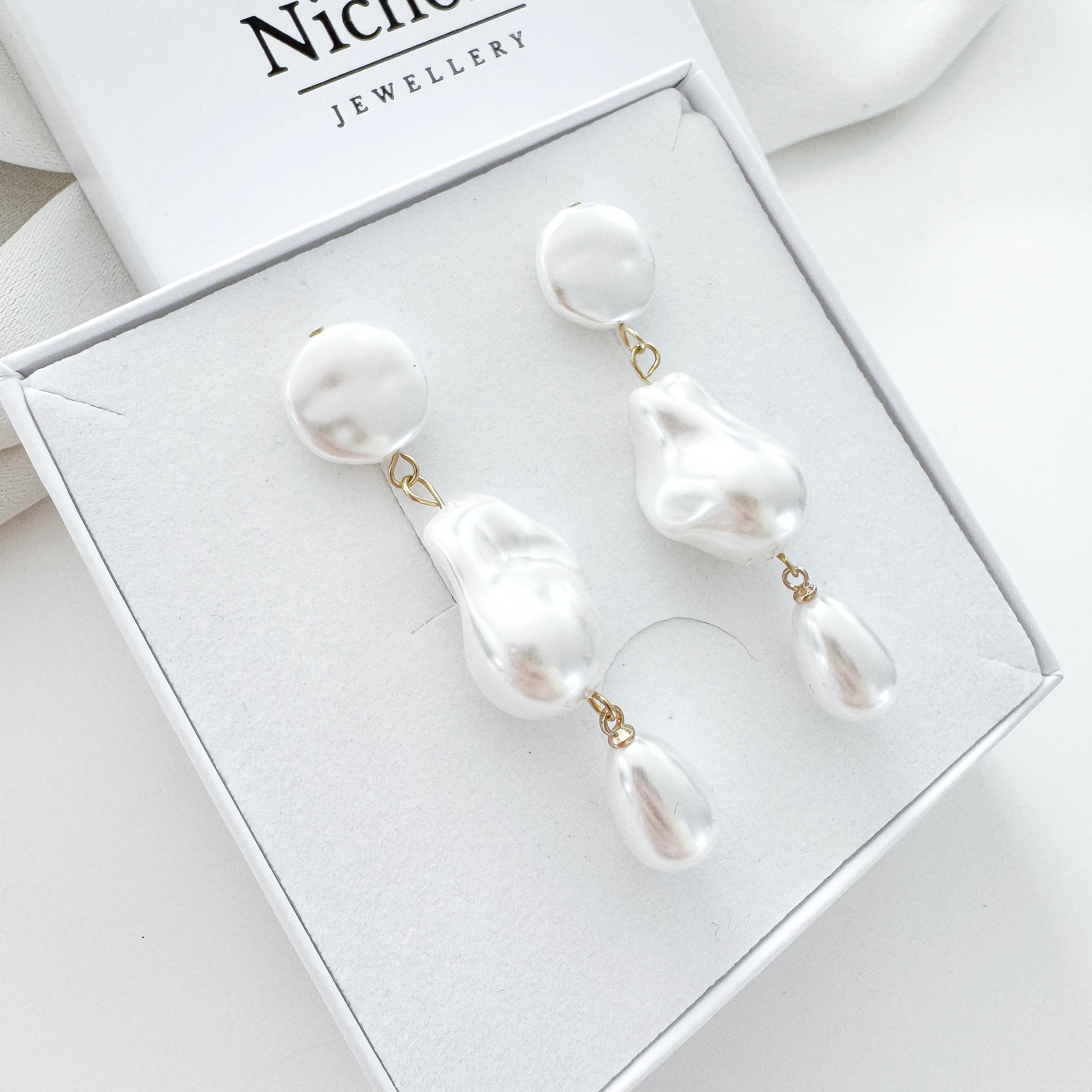 Imitation pearl drop earrings designed for modern brides, bridesmaids and elegant special occasions. These beautifully crafted earrings feature a graduated pearl design, with a round pearl at the top, followed by a baroque-style pearl and finished with a soft teardrop pearl drop.