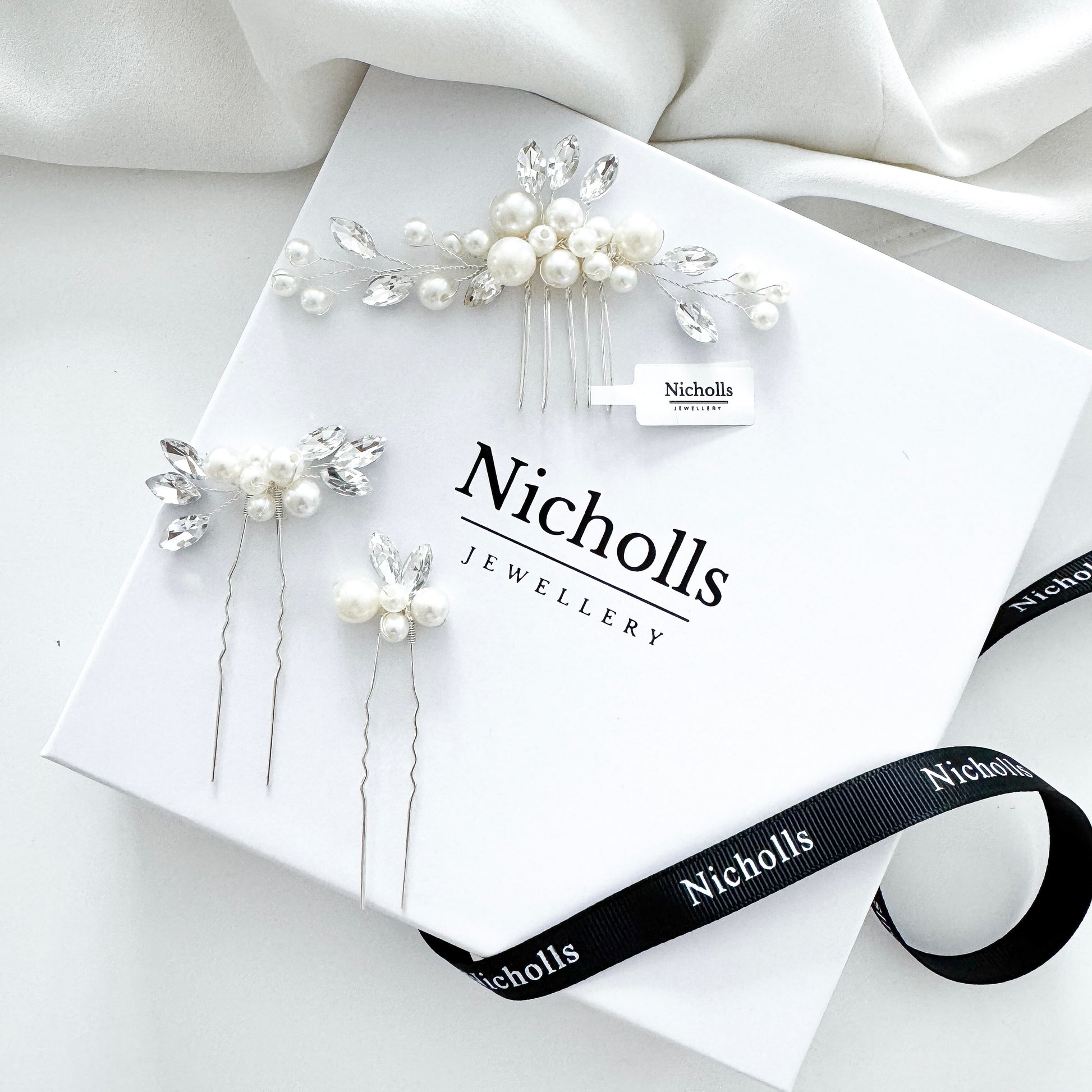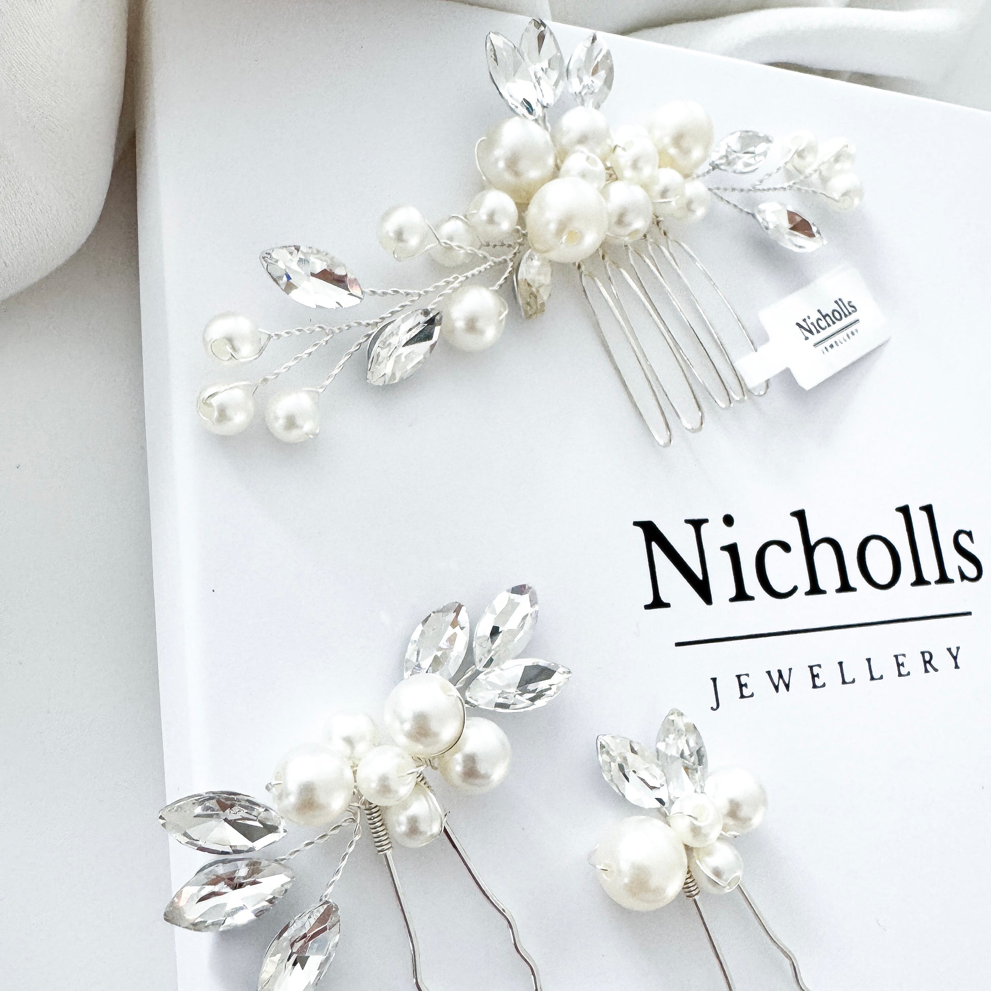 Handmade pearl & crystal bridal hair comb with matching pins. A timeless wedding hair accessory for brides & bridesmaids, perfect for elegant hairstyles.