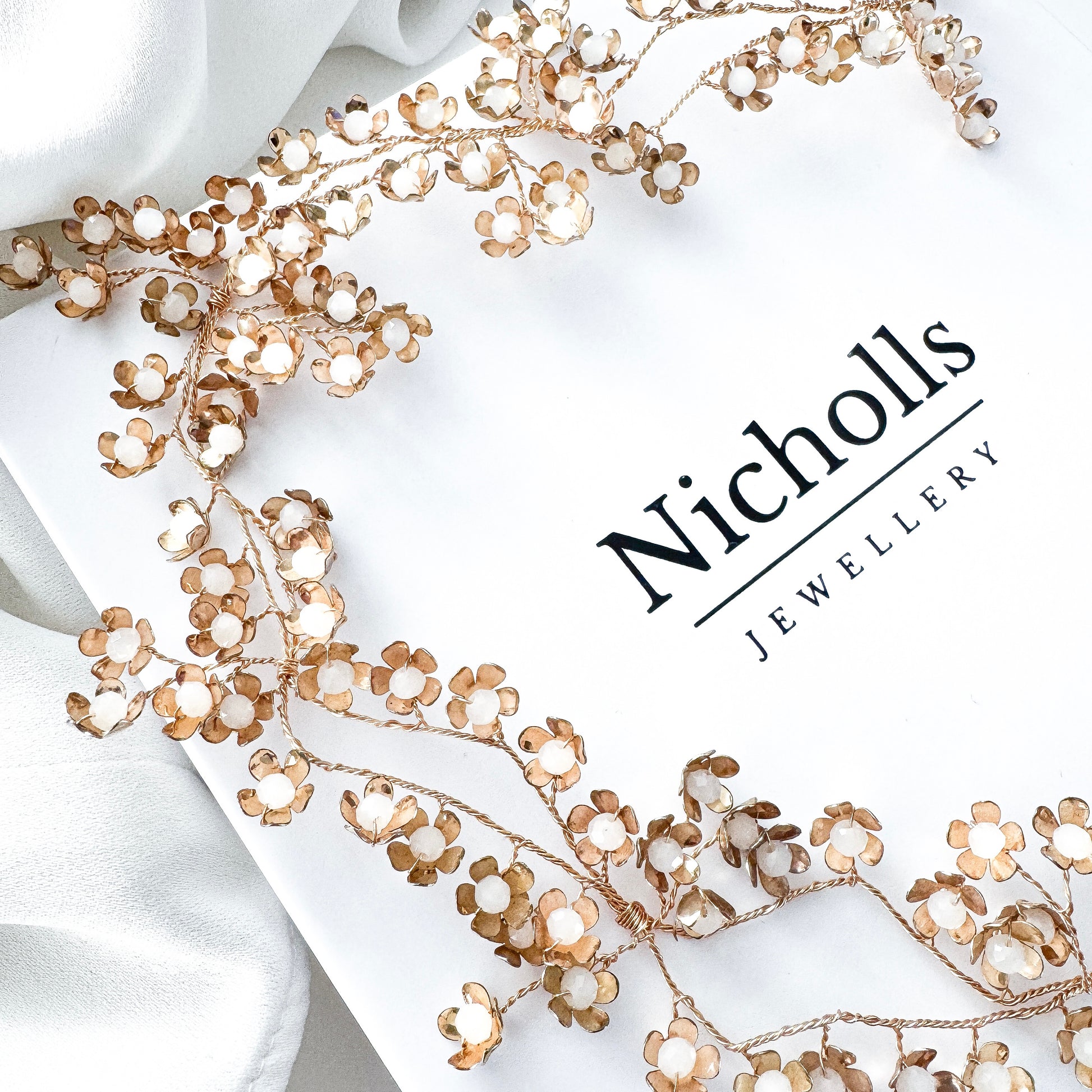Crafted from flexible gold-plated wire, this hair vine can be gently shaped to suit a variety of hairstyles — whether woven through loose waves, wrapped around an up-do, or styled as a subtle statement. The lightweight design features petite metal flowers accented with opaque beaded centres, creating a soft shimmer that catches the light beautifully.